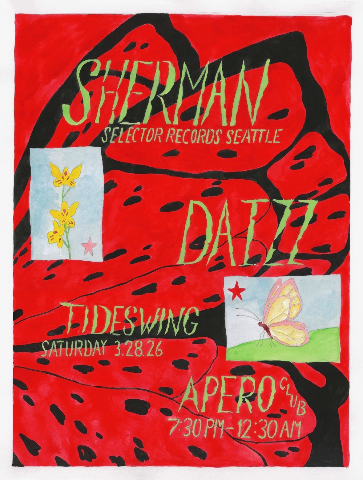 NOTE: presales are now sold out - tickets will be available at the door on a first come, first served basis. At our last party in November with Mungo Sound Machine, we reached capacity by 9pm or so. Get there early! $20 at the door :) tide swing invites one of the most respected record shop owners in the US for a 3 hour all vinyl set at Santa Cruz’s fav wine cave Apero Club. Warming things up, dancefloor favorite & TS resident Daizz kicks things off at 7:30. Glitch don SF visual artist Loaf Baker on visuals. this is an EXTREMELY limited capacity venue and tickets will likely not be available at the door. don’t sleep on this :) more info @tideswing.sc on insta hand painted flyer by Livia Charman