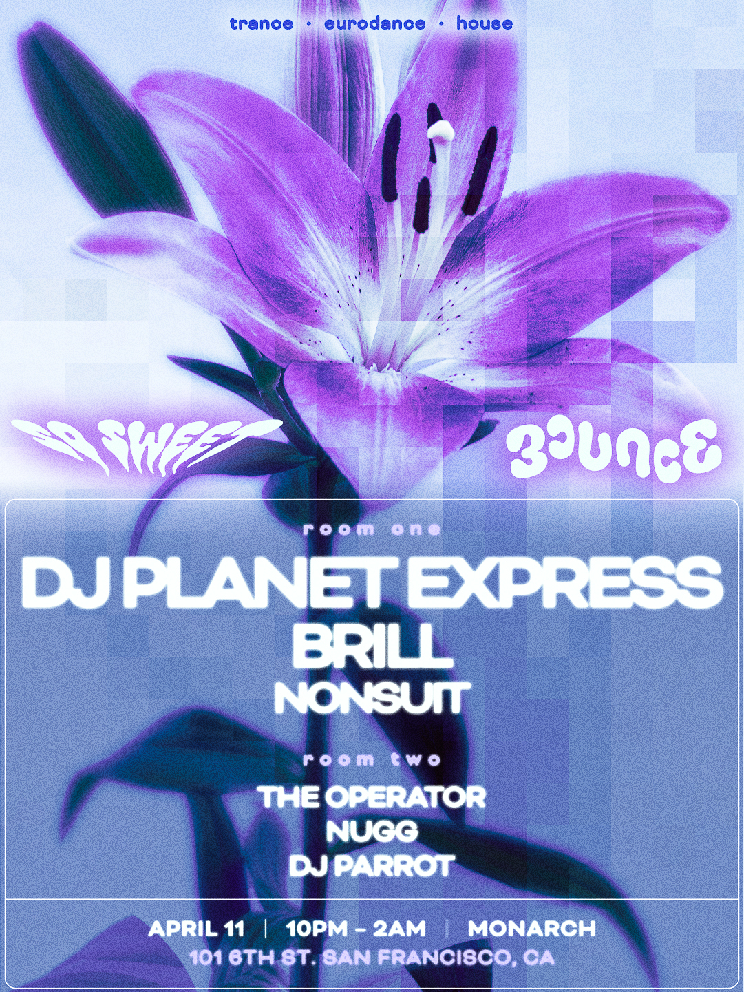 Bounce SF and So Sweet are teaming up for a night of high-energy eurotrance and hardgroove vibes. Join us on the dancefloor for a night of high-energy music, immersive lighting, and a room that stays moving from start to finish. From the first track to the final moments, expect a lineup that doesn't let up. If you’ve been waiting for a proper night out, this is it. Come ready to move, stay late, and leave it all on the floor. DJ Planet Express Electronic artist/producer Joseph Manzoli is a veteran of the Toronto and New York indie scenes where he splits time and has played parts in projects ginla, Katie McBride, Adrianne Lenker and with Nick Hakim. His body of work has been rapidly expanding with a steady stream of releases. While initially gaining traction in the lofi house scene in 2018, the artist's sound has aggressively evolved pulling from elements from the seminal electronic music genres of the past such as jungle, house, footwerk, juke, ambient, techno, drum & bass and more. A