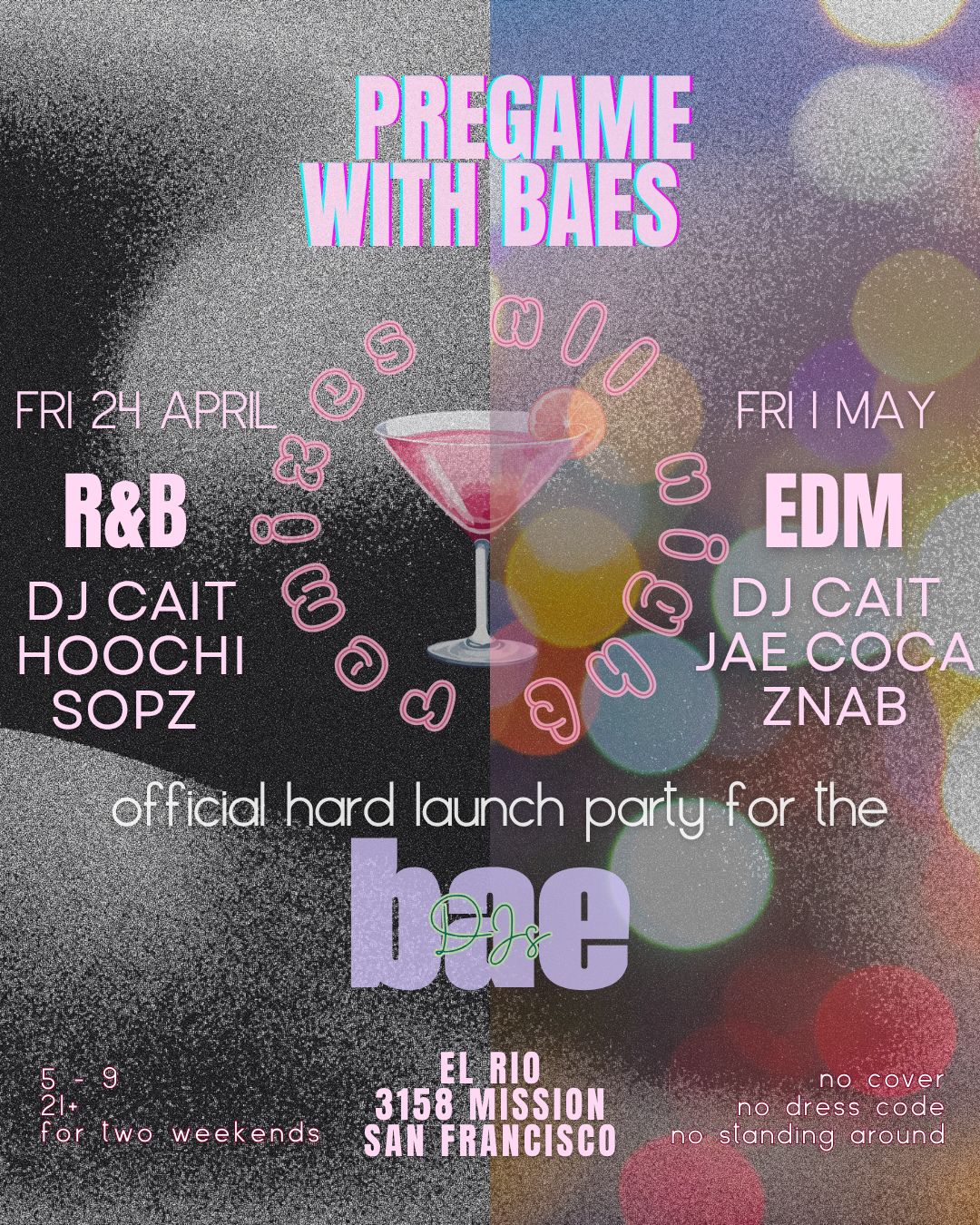 The Bae DJs Present: HARD LAUNCH El Rio April 24 & May 1 5PM – 9PM No Cover. No dress code. No standing around. Join The Bae DJs for our hard launch party. A two-night takeover introducing a collective of talented female DJs bringing you remix-forward sets and curated energy. The first night will be for R&B fans and the second night will be for the EDM crowd. DJ lineup (set times TBD): March 24 R&B Remixes DJ Cait hooCHi Sopz April 1 EDM Remixes DJ Cait Jae Coca ZNAB Bring a date or bring the girls to pregame for the weekend. Hope to see you at our first event of many.