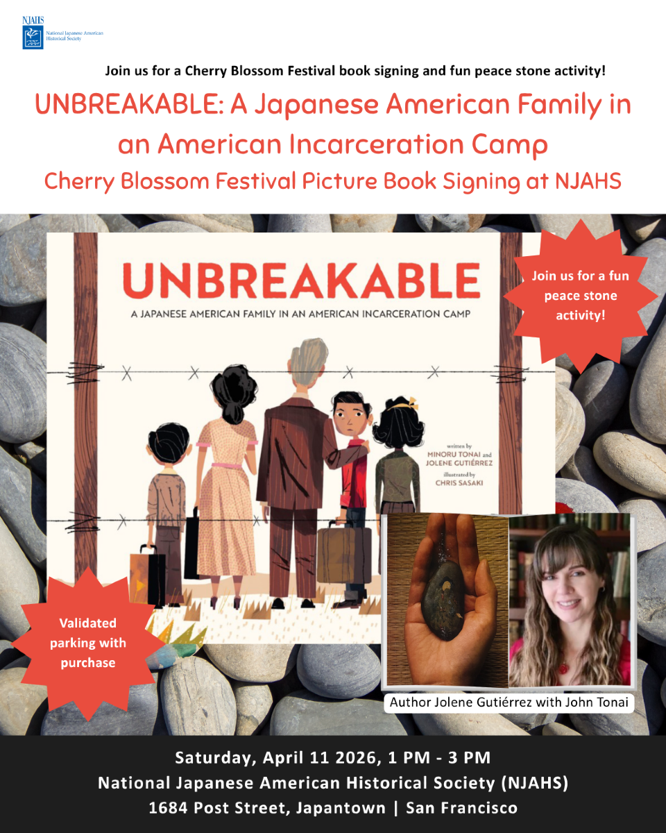 Cherry Blossom Festival book signing and fun family activity on Saturday, April 11, 2026 from 1-3 pm at NJAHS, Japantown, SF. UNBREAKABLE: A Japanese